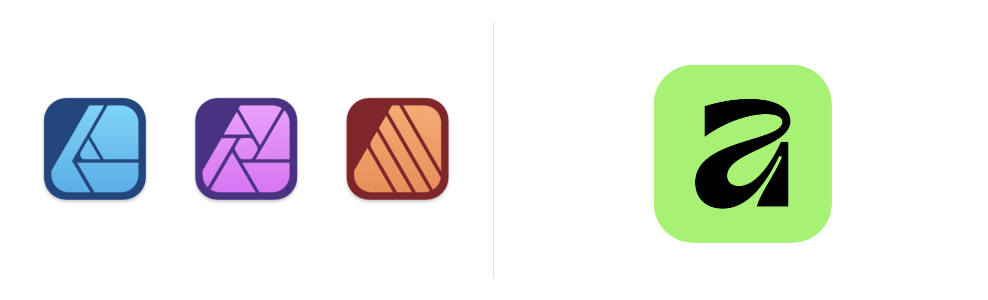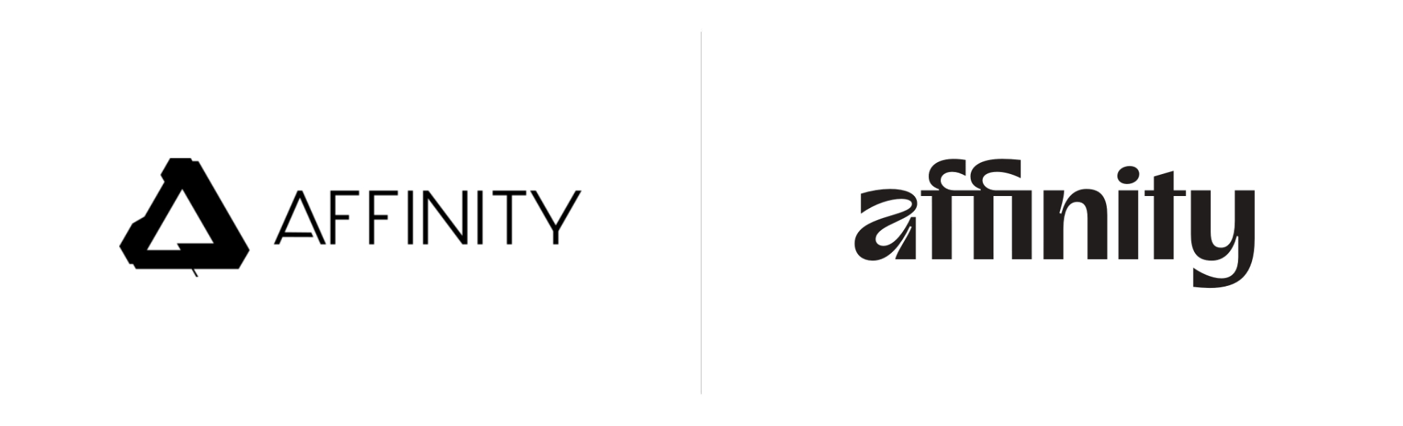 Do tej pory Affinity reprezentowane było przez znak, w którym widniał stylizowany trójkąt oraz nazwa marki złożona delikatnym, bezszeryfowym krojem. Pierwotnie trójkąt, wypełniany różnymi wzorami funkcjonował także jako ikony aplikacji, ale zrezygnowano z tego zabiegu. Sam trójkąt, w wersji monochromatycznej był dość charakterystyczny, ale też moim zdaniem trochę zbyt skomplikowany.