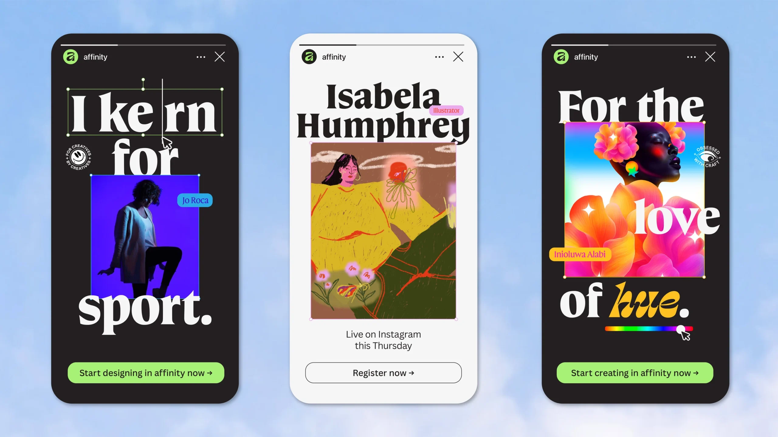 Rebranding, za który odpowiada dyrektor kreatywny Canva na Europę, Tom Carey we współpracy z Design by Twist, miał trzy istotne cele – wyróżniać aplikację na tle innych profesjonalnych narzędzi do projektowania, zerwać z dotychczasowym wizerunkiem oraz co na pierwszy rzut oka wydaje się najtrudniejsze, podkreślić związek Affinity z Canva, ale jednocześnie odrębność tych narzędzi. Motto Affinity brzmi „dla kreatywnych, od kreatywnych” i nowa identyfikacja wizualna to odzwierciedla.