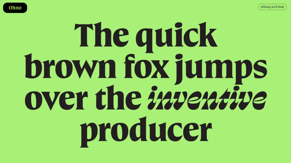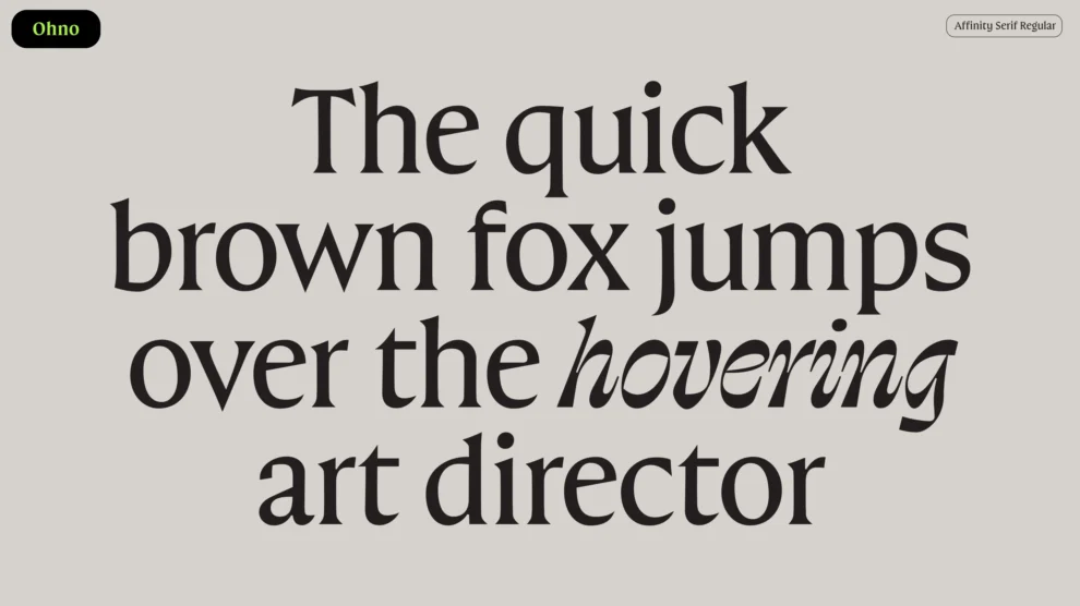 Za warstwę typograficzną odpowiada ekipa Ohno. Krój pisma Affinity Serif stanowi niestandardową adaptację kroju Swear. Nowy krój dostępny jest w sześciu grubościach. Według wypowiedzi Toma Careya dla itsnicethat „w wersji lekkiej i małej jest niezwykle precyzyjny i wysokiej jakości; w dużej, grubej, ekspresyjnej kursywie wygląda bardziej wyraziście i nieco dziwnie”
